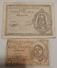 29.11.1944; 2.2.1945; 3.4.1945; 7.5.1945. Purple on blue underprint. Portrait young woman at lower right. Similar to number 78. Back: Two youths with plants.Watermark: BANQUE de l'ALGÉRIE. Signature titles: Le Caissier Principal and Le Secrétaire Général.