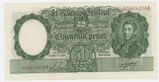 ND (1955-1965). Purple. Portrait Gen. San Martin in uniform at right. 9 signature varieties. 3 serial number varieties in red or black. Serie B, C. Back: Sailing ship. Signature titles: SUBGERENTE GENERAL and VICE-PRESIDENTE.