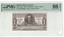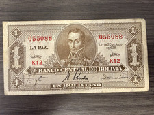 L.1928. Deep brown on green, orange and rose underprint. Portrait S. BolÃvar at left, view of Potosà and mountain at right center. Series A-Z; A1-A6. Many signature varieties. Back: Deep blue. Arms. Printer: ABNC.