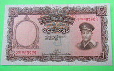 ND (1958). Brown and multicolor. General Aung San with hat at right. Back: Brown. Woman and spinning wheel. Similar to number 43.Watermark: General Aung San with hat.
