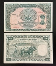 ND (1958). Green and multicolor. General Aung San with hat at right. Back: Green. Worker with oxen. Similar to number 45.Watermark: General Aung San with hat.