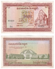 ND (1955). Brown. Temple of Banteal Srei at right. Back: brown and green. Central market at Phnom-Penh. Watermark: Buddha. Printer: TDLR (without imprint). Specimen.