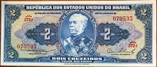 ND (1954-1958). Blue on multicolor guilloches. Portrait D. de Caxias at center. Like number 133. 2 printed signatures. Back: Gold. Military school at center. Printer: ABNC. Series number 901-1135.