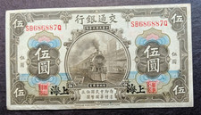 1.10.1914. Steam passenger train at center. Back: Post Office at center. Printer: ABNC. With various overprints. SHANGHAI. Dark brown and multicolor. Shanghai overprint in black with red signature seals. (S/M number C126-93a).
