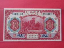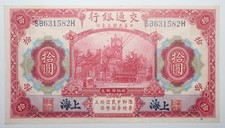 1.10.1914. Maritime Customs building, streetcar at center. Back: Ship at dockside, steam passenger train at center. Printer: ABNC. With various overprints. SHANGHAI. Red and multicolor. Shanghai in blue-black with red signature seals. (S/M number C126-115b).