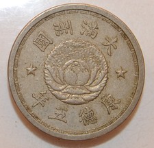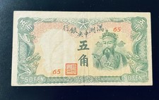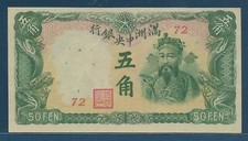 ND (1941). 5 Chiao = 50 Fen. Green on pink and orange underprint. Ch'ien Lung at right. Back: Blue. Specimen with overprint: Yang Pen and Specimen. Uniface pair.