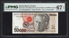 ND (1992). Dark brown and red-orange on multicolored underprint. C. Cascudo at center right and as watermark. Two men on raft in background at left center. Folklore dancers at left center on back. Series 1-6289.