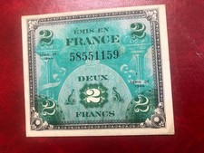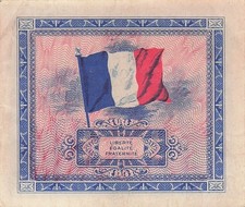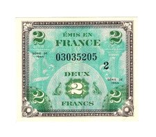 1944. Green with black border. Torch at left and right in green underprint. With text: EMIS EN FRANCE. Back: Blue on red underprint. Printer: Forbes Lithograph Manufacturing Co., Boston. Replacement notes with X near serial number . Block p2.