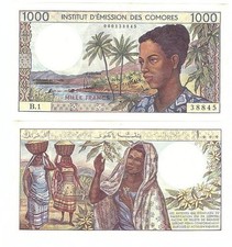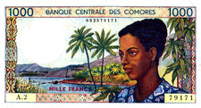 ND (1976). Blue-gray, brown, and green on multicolored underprint. Woman at right, palm tree at waters edge in background. Women on back. Watermark: crescent on Maltese cross. Institut d'Emission des Comores.