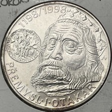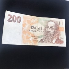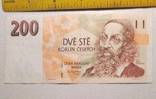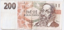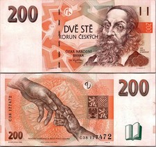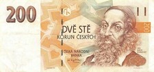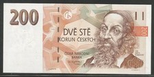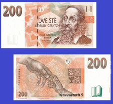 1998. Deep brown on light orange and light green underprint. Jan Amos Komensky at right and as watermark, arms at center right. With stylized open book at lower right on back. Back: hands outreached at left center, stylized open book at lower right. Printer: STC-P. Serial prefix C. Arms at center right. Only value in watermark area on back. Fibers added to paper. Artists: Kulhanek, engraving Ondracek, Fajt.