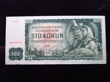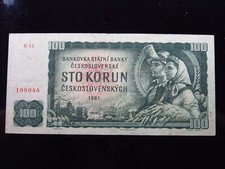 1961. Deep green on multicolored underprint. Factory at lower left, farm couple at right. Charles Bridge and Hradcany in Prague on back. Printer: STC-Prague. Watermark: star within linden leaf, repeated. Series prefix B01-40 (wet printing).
