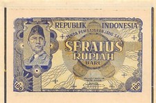17.8.1949. . Portrait Sukarno at upper left. Brown on yellow underprint. Black signature.
