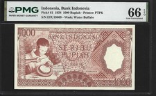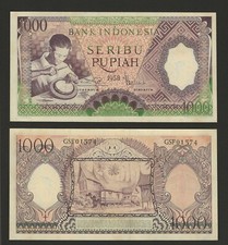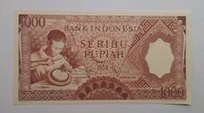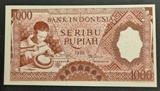 1958. Red-brown. Man making a silver plate at left. Back: Brown and green. Indonesian house. Watermark: Buffalo.
