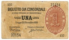 1 LIRA BIGLIETTO GIÀ CONSORZIALE REGNO D'ITALIA 25/12/1881 BB+