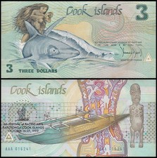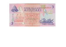 ND (1992). Lilac and green on multicolored underprint. Back purple, orange, and multicolored. AITUTAKI at upper center, local drummers at left, dancers at center, blue lorikeet and fish at right. Worshippers at church with cemetery at center on face. Watermark: sea turtle. As specimen.
