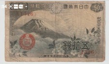 1938. Black on yellow and blue underprint. Mt. Fuji and cherry blossoms. (Showa yr. 13 at l.) Back: Light green. Specimen with small stamping: Mi-hon. Regular block number.