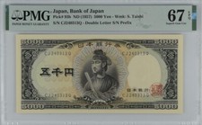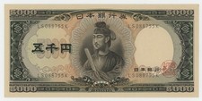 ND (1957). Dark green on multicolor underprint. Portrait p6 at center. Back: Green. Bank of Japan at center. Watermark: Portrait p6. Single letter serial number prefix.