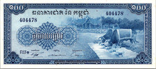 ND (1956-1975). Brown on multicolored underprint. Combine harvester at right. Phnom Pehn pagoda on back. Watermark: buddha. Printer: BWC (without imprint).