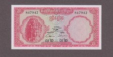 ND (1962-1975). Red-brown on multicolored underprint. Temple of Banteay Srei at right. Central Market building at Phnom-Penh at left on back. Watermark: buddha. Printer: TDLR (without imprint).