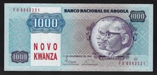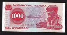 1987. Purple, blue-black, and blue on light blue and multicolored underprint. Soldiers embarking dockside at left center, and soldier at right on back. Conjoined busts of Jose Eduardo dos Santos and Antonio Agostinho Neto at right. Arms at lower left on back. Watermark: bird(weak).