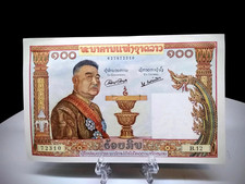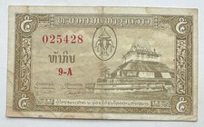ND (1957). Purple. Lao Tricephalic Elephant Arms at upper center. Government palace at right. Back: woman weaving. Printer: SBNC.