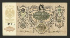 1919 (1920). Blue on yellow and multicolor underprint. 10 signature varieties. Back: Arms at center. Text in 7 languages, says: "Workers of the World, Unite!" Watermark: Broad waves.