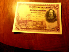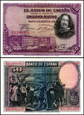 15.8.1928. Violet and black on pale blue and dull orange underprint. Prado Museum in Madrid at lower left and center, Diego Velázquez at right. Back: Painting La rendición de Breda by Velázquez. Watermark: Woman. Printer: BWC. Specimen.