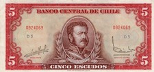 ND (1964). Red and brown-violet on multicolored underprint. Portrait of Manuel Bulnes at center. Battle of Rancagua at center, red-brown arms at left on back. Six or seven digit serial number. Watermark: Balmaceda. Printer: CdM-Chile. Series A-E.
