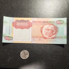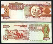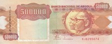 Portrait conjoined busts of Jose Eduardo dos Santos and Antonio Agostinho Neto at right and as watermark. Arms at lower left on right.
