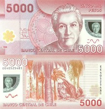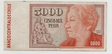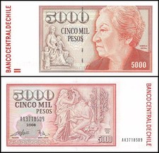 1991. Brown and red-violet on multicolored underprint. Allegorical woman with musical instrument, seated male at center. Statue of woman with children at left center, Gabriela Mistral at right on back and as watermark. Printer: CdM-Chile. Signature titles: PRESIDENTE and GERENTE GENERAL INTERINO.