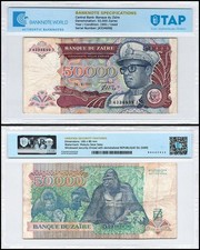 24.4.1991. Wine and blue-black on multicolor underprint. Mobutu in military dress at right, leopard at lower left center facing left, arms at lower right. Back: Family of Western Gorillas. Watermark: Mobutu in military dress. Printer: G&D. Replacement notes: Serial number prefix Z. Specimen.