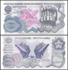 Aug. 1989. Deep purple and blue on lilac underprint. Arms at left, Partisan monument "Kozara" at right. Back: Partisan monument "Sutjeska" at center. Specimen.