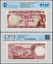 ND (1971). Brown on lilac and light green underprint. Queen Elizabeth II at right. Arms heading: GOVERNMENT OF FIJI at upper center. Yanuca beach scenes in Yasewas on back. Watermark: profile of Fijian. Printer: TDLR. Only one signature. As a replacment banknote with a Z/1 prefix.