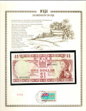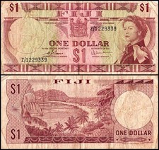ND (1974). Brown on brown, green, and pink underprint. Queen Elizabeth II at right. Arms heading: FIJI at upper center, issuing authority name across lower center. Yanuca beach scenes in Yasewas on back. Watermark: profile of Fijian. Printer: TDLR. As a replacment banknote with a Z/1 prefix.