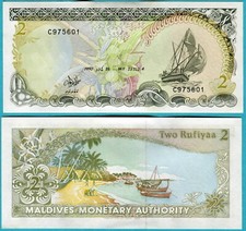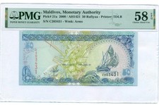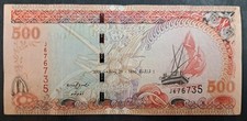 2000/AH1421. Dark green and brown on multicolored underprint; light blue underprint at left. Dhow at right. Tomb of Medhuziyaaraiy at center on back. Watermark: arms. Printer: TDLR. Enhanced UV features.