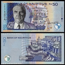 1999. Black, purple, and deep blue on multicolored underprint. J. M. Paturau at left, arms at lower left, building facades at center, standing Justice with scales at lower right in underprint. Ascending size serial number. Back: building complex at center right. Watermark: dodo bird's head.