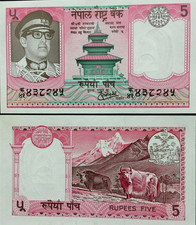 ND (1974). Red, brown and green. King Birendra Bir Bikram in military uniform with dark cap at left, temple at center. . Back: Red and brown. Two yaks at center. Watermark: Plumed crown.