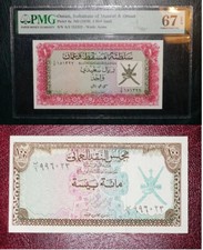 ND (1970). Red and olive-green on multicolor underprint. Arms at right. Back: Sohar Fort. Watermark: Arms. Color trial in blue.
