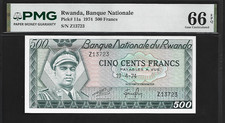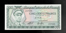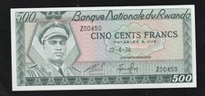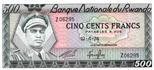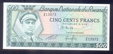 19.4.1974. Green and multicolor. General Habyarimana at left. Back: Man with basket on head at left, rows of plants in background.