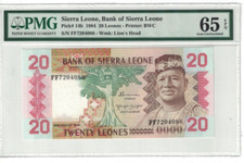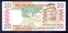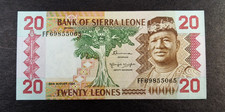 24.8.1984. Brown, red and green on multicolor underprint. Tree at center, President S. Stevens at right. Back: Two youths pan mining (gold or diamonds). Watermark: Lion's head. Printer: BWC.