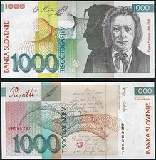 8.10.1997. Black, violet-brown and brown-orange on multicolor underprint. I. Gallus at right, musical façade at left. Back: Drawing of Slovenia's Philharmonic building at upper left, five lines of medieval music at upper cen Watermark: I. Gallus. Replacement notes: Serial number prefix AZ and possibly others.