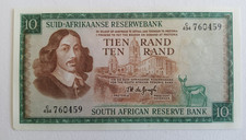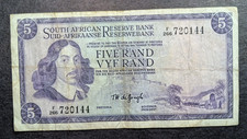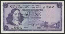 ND (1966). Purple on multicolor underprint. Jan van Riebeeck at left, first lines of bank name and value in Afrikaans. Back: Factory with trains. watermark: Springbok. Replacement notes: Serial number prefix Z/1; Y/1; X/1; W/1 respectively.