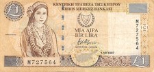 1.10.1997; 1.12.1998; 1.2.2001; 1.4.2004. Brown on light tan and multicolored underprint. Cypriot girl at left, arms at upper center. Handcrafts and Kato Drys village scene in background on back. Watermark: bust of Aphrodite. Wide security foil. Printer: F-CO (without imprint).