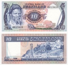 ND (1985). Blue-black on blue and multicolor underprint. King Sobhuza II at left, without commemorative inscription. Back: Asbestos mine. Watermark: Shield and spears. Printer: TDLR. Serial number prefix W. Replacement notes: Serial number prefix Z. Specimen.