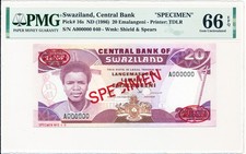 ND (1986). Violet, brown and purple on multicolor underprint. Facing portrait of young King Mswati III at left, arms at lower center. Back: Cattle and truck. Watermark: Shield and spears. Printer: TDLR. Replacement notes: Serial number prefix Z.