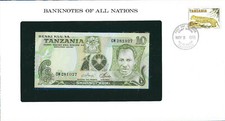 ND (1978). Green on multicolor underprint. Arms at top center, President J. Nyerere at right. Back: Monument and mountain at center. Watermark: Giraffe's head. Replacement notes: Serial number prefix ZZ; ZY.
