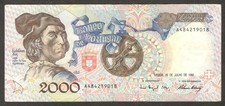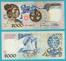16.7.1992. Dark brown and blue on multicolor underprint. Bartholomeu Dias at left, astrolabe at center. Ch. 1. Back: Sailing ship at center, arms at right. Watermark: Bartholomeu Dias. 6 signature varieties.