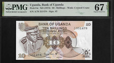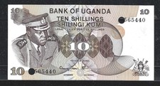 ND (1973). Brown on multicolor underprint. President Idi Amin at left, arms at lower right. Back: Elephants, antelope and hippopotamus. Watermark: Crested crane. Signature titles: GOVERNOR and DIRECTOR. Replacement notes: Serial number prefix Z/1 (5/ and 10/); Y/1; X/1; W/1 respectively.
