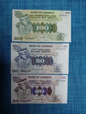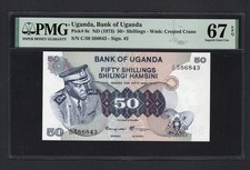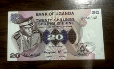ND (1973). Purple and brown on multicolor underprint. President Idi Amin at left, arms at lower right. Back: Large building. Watermark: Crested crane. Signature titles: GOVERNOR and SECRETARY. Replacement notes: Serial number prefix Z/1 (5/ and 10/); Y/1; X/1; W/1 respectively.
