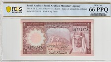 L. AH1379 (1977). Red-brown on multicolor underprint. Portrait of King Faisal at right, Hill of Light at center. Back: Airport at left center. Watermark: King Faisal.